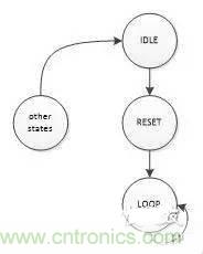 CPLD其內部沒有RAM,這樣就不能依靠RAM的初始化數據來產生可靠的複位;從cong原yuan理li上shang說shuo,器qi件jian上shang電dian後hou,其qi寄ji存cun器qi的de狀zhuang態tai是shi不bu確que定ding的de,因yin此ci我wo們men是shi沒mei法fa得de到dao一yi個ge確que定ding的de初chu始shi狀zhuang態tai去qu產chan生sheng一yi個ge可ke靠kao的de內nei部bu複fu位wei信xin號hao,不bu過guo我wo們men還hai是shi可ke以yi產chan生sheng一yi個ge有you一yi定ding失shi敗bai概gai率lv但dan概gai率lv可ke控kong的de複fu位wei信xin號hao,其qi基ji本ben原yuan理li是shi:設計一個n位的狀態機,見下圖,其中一種狀態表示複位結束(記為LOOP),隻要進入該狀態就會一直保持在LOOP狀態上,至於其他狀態都會跳入複位狀態(記為RESET),RESET狀態是暫態,一個時鍾周期就離開進入LOOP狀態;由於狀態LOOP出現的概率僅為:1/2n,我們控製n的長度,就可以將複位失敗概率控製在設定的要求內。