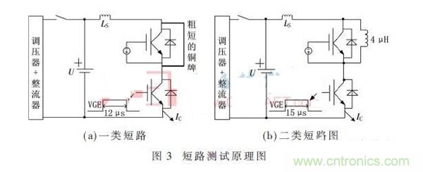 圖3(a)為一類短路測試原理圖,電網電壓經過調壓器和整流橋,將母線電容電壓充到1 500 V,上管igbt的門極被-15 V關斷,且用粗短的銅排將其短路。對下管的IGBT釋放一個12 μs的單脈衝,直通就形成一類短路。圖3(b)為二類短路測試原理圖,將母線電容電壓同樣充到1 500 V,上管IGBT的門極被-15 V關斷,且給上管並聯一個4 μH的電感作為負載,下橋臂通過IGBT驅動器釋放一個15 μs的單脈衝就形成二類短路。