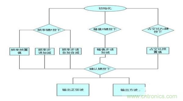 本係統要求在給定±15V電源電壓條件下設計出一個能產生正波和脈衝波的信號源。信號頻率為20Hz~20kHz,頻率能程控步進調整(步長為5Hz),脈衝波的占空比在2%~98%之間能程控步進調整(步長2%),兩路信號均要求幅值在100mv到3V步進可調(步長為100mv),要求性能良好(頻率穩度高,非線性失真小等),方案考慮如下: