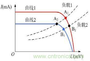 最大功率點A1→最大功率點B1(條件:將係統負載特性由負載1改為負載2)