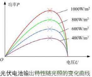 在(zai)一(yi)定(ding)的(de)光(guang)照(zhao)強(qiang)度(du)和(he)環(huan)境(jing)溫(wen)度(du)下(xia),光(guang)伏(fu)電(dian)池(chi)可(ke)以(yi)工(gong)作(zuo)在(zai)不(bu)同(tong)的(de)輸(shu)出(chu)電(dian)壓(ya),但(dan)是(shi)隻(zhi)有(you)在(zai)某(mou)一(yi)輸(shu)出(chu)電(dian)壓(ya)值(zhi)時(shi),光(guang)伏(fu)電(dian)池(chi)的(de)輸(shu)出(chu)功(gong)率(lv)才(cai)能(neng)達(da)到(dao)最(zui)大(da)值(zhi),這(zhe)時(shi)光(guang)伏(fu)電(dian)池(chi)的(de)工(gong)作(zuo)點(dian)就(jiu)達(da)到(dao)了(le)輸(shu)出(chu)功(gong)率(lv)電(dian)壓(ya)曲(qu)線(xian)的(de)最(zui)高(gao)點(dian),稱(cheng)之(zhi)為(wei)最(zui)大(da)功(gong)率(lv)點(dian)。如(ru)圖(tu)2所示為MPPT受光照影響圖、圖 3所示為MPPT受溫度影響圖