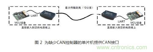 雖然如今已經不再是51單片機橫行的時代,但是仍然不是所有的MCU都具備CAN控製器,如果在某個項目中需要擴展CAN通訊而恰好我們的主控平台沒有CAN外設,那麼選擇CSM100就是一個絕佳的選擇。隻要主控上還有多餘的URAT資源就可以利用它輕鬆的擴展。擴展方式如圖2所示。