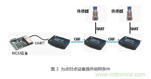 我們都知道CAN總線是一種多主總線,可以實現多節點組網通訊,自帶優先級仲裁機製,可有效防止數據衝突。基於這一優點,可以利用CSM100模塊為點對點通訊設備提供組網的條件。例如,某些串口接口的傳感器,如果我們需要把多個傳感器的數據讀到MCU而MCU的串口數量不足怎麼辦呢?