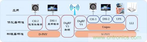 下圖2所示MIPI結構分為物理層、協議層和應用層。目前比較成熟的MIPI應用有攝像頭CSI接口、顯示屏DSI接口和基帶和射頻間DigRF接口,而其他例如UFS、LLI等規範正在逐步製定和完善過程中。
