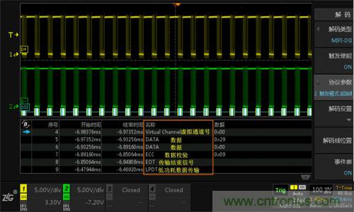 (2)ZDS4054 Plus標配512Mpts的存儲深度,且可對全內存數據進行解碼,MIPI-DSI協議解碼界麵如圖8所示。可通過事件表查看具體的解碼內容,也可以將事件表中的內容通過導出報表的格式將其導出。