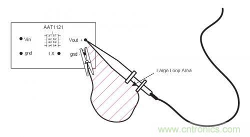 下(xia)圖(tu)是(shi)一(yi)個(ge)錯(cuo)誤(wu)的(de)測(ce)量(liang)方(fang)式(shi),因(yin)為(wei)示(shi)波(bo)器(qi)的(de)地(di)線(xian)會(hui)拾(shi)取(qu)輻(fu)射(she)噪(zao)聲(sheng)。示(shi)波(bo)器(qi)的(de)地(di)線(xian)和(he)信(xin)號(hao)探(tan)頭(tou)形(xing)成(cheng)的(de)環(huan)路(lu)形(xing)成(cheng)了(le)一(yi)個(ge)天(tian)線(xian)。環(huan)路(lu)麵(mian)積(ji)越(yue)大(da),在(zai)電(dian)源(yuan)PWM切換時,示波器接受到的開關噪聲就越大。