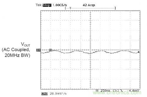 下圖是采用20MHz帶寬限製測試到的電源的紋波以及噪聲。示波器20MHz的帶寬限製是為了防止無源探頭帶入的共模噪聲。可以看到AAT1121BUCK轉換器的紋波噪聲為10mVp-p,幾乎看不到開關噪聲。這主要是歸功於BUCK控製器的低噪聲設計,良好的PCB設計,以及恰當的測試方法。