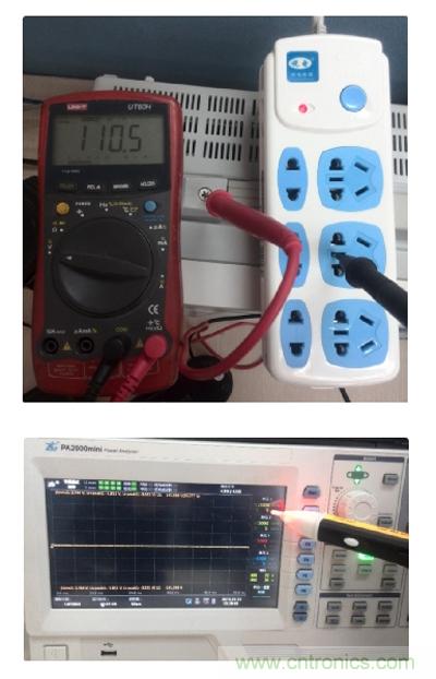 故意減掉PA2000mini功率分析儀的地線,這時候儀器處於接地不良的狀態,機殼會帶110V電壓,會發生觸電危險!