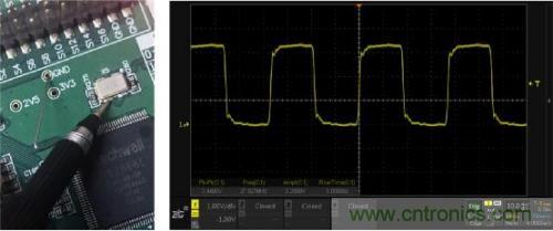 以晶振信號測量為例,如圖1所示為常規的鱷魚線接地測量方法,可看到信號過衝嚴重伴隨振蕩,和想像中的方波不一樣。而圖2所示的短地線彈簧接地測量方法,波形端正不少,顯然資深工程師的方法沒錯。