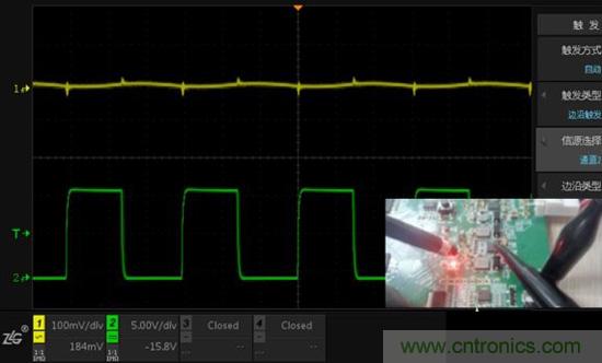 測試方法:通道1測量小信號(100mv/div),通道2測量大信號(5V/div),觀察信號互相影響的情況。