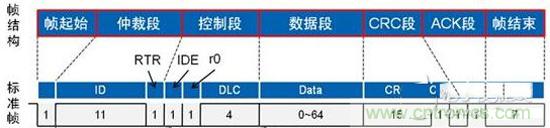 以標準數椐幀為例,從結構上看分成7段,分別為起始段、仲裁段、控製段、數椐段、CRC校驗段、ACK應答段、幀結束段,如圖1所示: