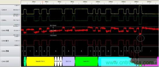 【導讀】CAN總線一直以實時性強、傳輸距離遠、抗幹擾能力強、數據保證到達等特點而廣泛應用於高可靠性的場合。但常常在觀察CAN通信波形時,我們會發現差分電平在ACK段突然增高,這是什麼原因導致的呢?這裏結合測試實例對ACK電平偏高的原因做簡單分析。