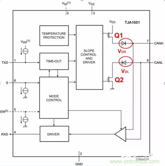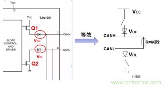 總線顯性時(邏輯為0),收發器內部Q1、Q2導通,CANH、CANL之間產生壓差;隱性時(邏輯為1),Q1、Q2截止,CANH、CANL處於無源狀態,壓差為0。