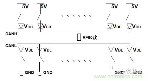 然而,CAN收發器在輸出顯性時,CANH電平並不是標準的3.5V,而是5V(VCC)通過一個二極管降壓得到的,二極管的壓降由負載電流決定。圖6所示的VDH為CANH對應的二極管壓降,VDL為CANL對於的二極管壓降,流過的電流越大,二極管的壓降就越大。可知: