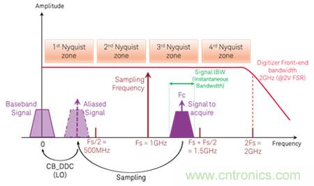 在數字化儀中,您可以考慮選擇超過采樣率(fn)一半的帶寬。有時可以通過欠采樣(undersampling)和特殊輸入濾波來捕獲大於 Fs/2 的頻率。例如,是德科技的 M9203A 和 M9703B 數字化儀支持 2 GHz 帶寬,ADC 采樣時鍾速率為 1.6 GS/s,允許使用欠采樣直接進行下變頻。