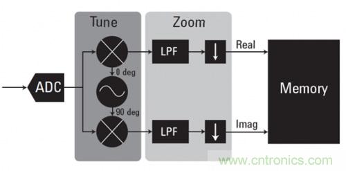 數字化儀采用諸如零抑製(zero suppress)等數據壓縮技術,隻保留超過給定閾值的相關信號。它們還使用數據打包和四舍五入來優化可用存儲器空間。也使用諸如數字下變頻(DDC)等實時數據壓縮技術。DDC 直接在 ADC 數據上進行數據的頻率轉換和抽取。圖 3 中的框圖顯示了其基本原理。捕獲到複雜的 IQ 數據,可以使中心頻率下變頻到 0 Hz。然後使用濾波和數據抽取來去除不需要的頻率分量,縮減所需數據的大小。在對寬帶采集中的一小段頻譜進行分析時,DDC 非常有價值。DDC 不僅可以減少所需的存儲空間,而且可以降低寬帶綜合噪聲,改善整體信噪比(SNR)。