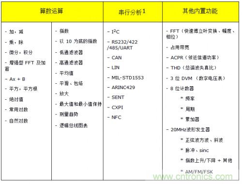 ·celianghefenxi。shiboqizhenduiyiyongxingheceliangsudujinxingleyouhua。tamendeyingjianzhongneizhilegezhongcelianghefenxigongju。ruguoshitaishishiboqi,yonghukeyicongtaishiyiqideqianmianbanfangwenzhexiecelianghegongju,ruguoshimokuaihuayiqi,yonghukeyicongruanjianqianmianbanfangwen。zheshideshiboqifeichangshiheyongyuzaishejihuoguzhangzhenduanqijianjinxingdegezhongchangjianceshi。youyuceliangzaiyingjianzhongzhixing,yincikeyikuaisuhuoqujieguo,suoduanceshitaihuo ATE 環境的測量時間。以下所示為 InfiniiVision 係列示波器中提供的一些算數運算、FFT 和串行協議分析工具。
