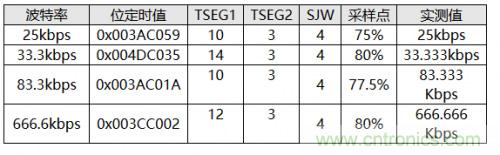 同步跳轉寬度(SJW):SJW的值直接影響到重同步時相位緩衝段的可調節的範圍,SJW的值可以在1~4之間選擇,我們選擇3、4可以使總線獲得更寬的波特率容忍度;