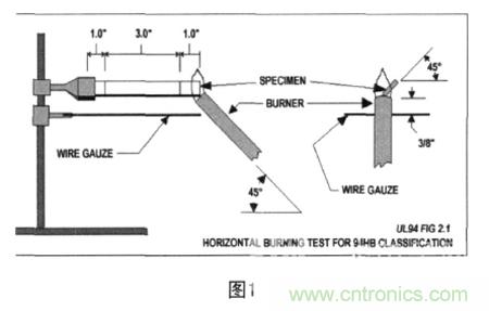 試樣水平放置,樣品的尺寸為125mm&TImes;13mm&TImes;厚度(大不能超過超過13mm),各自在距點燃端25mm和100mm做好標記,在距25mm標線遠端用試樣夾夾持住試樣,本生燈成45度角傾斜,不改變火焰的位置對試樣施加30s±1s的時間,對於該試驗的試樣材料又分成可自撐材料和非自撐材料兩種。