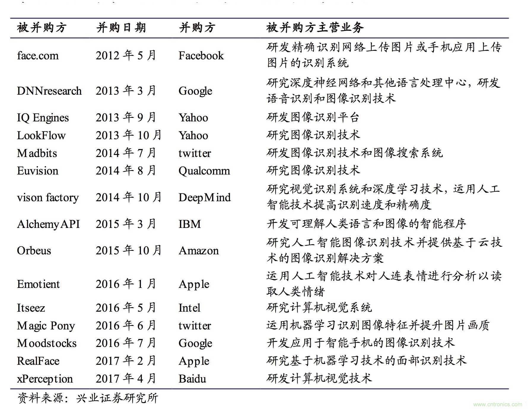 從終端廠商來看,蘋果、三星、華為、Facebook、gugededuoxiangzhuanlixianshi,gedazhongduanjutoudouzaifenfenbujurenlianshibiejishu。gejiakejijutouzhuyaoshicaiyongziyanweizhu,binggouweifudefazhanzhanlve。waiyanbinggoudelirupingguo、Facebook等。蘋果在人臉識別的應用專注於手機端,先後收購PolarRose,PrimeSense,Perceptio,Faceshift,Emotient,Turi等人臉識別相關技術公司;Facebook 2012年收購了以色列臉部識別公司Face.com。以下表格總結了國外巨頭公司 近幾年在人臉識別領域及其上下遊發生的外延並購。