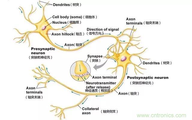 人腦神經元在接受到刺激後,其細胞膜內外帶電離子分布將發生變化,因而形成電位差,電位差將沿著神經細胞軸突、樹突雙向傳導,形成脈衝電流。而當該電信號傳遞到突觸時,突觸前神經元將釋放神經遞質(如多巴胺、腎上腺素)由突觸後神經元接受神經遞質產生興奮(該過程單向傳遞),並向下傳遞作用與人體反應器並發生反應。