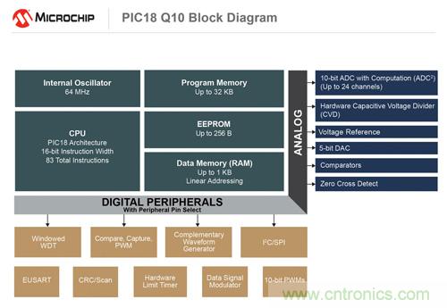 新型ATtiny1607係列采用緊湊型3 x 3 mm 20引腳QFN封裝,針對空間受限的閉環控製係統(如手持式電動工具和遙控器)進行了優化。 該係列器件不僅集成了高速模數轉換器(ADC),提高模擬信號轉換速度從而產生確定性係統響應,還提高了振蕩器精度,使設計師能夠減少外部元件並節省成本。 PIC18 Q10係列的CIP包括互補波形發生器 (CWG)外設,可簡化複雜的開關設計;帶計算功能的模數轉換器 (ADC2),可在硬件中執行高級計算和數據過濾,完全無需內核幹預。 此類CIP讓CPU能夠執行人機接口 (HMI) 控製等更複雜的任務,並在無處理需求時保持低功能模式,實現節能。