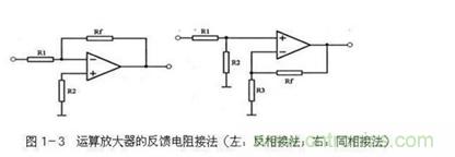 其次,由於放大倍數為無窮大,所以不能將運算放大器直接用來做放大器用,必須要將輸出的信號反饋到反相輸入端(稱為負反饋)來降低它的放大倍數。如圖1-3中左圖所示,R1dezuoyongjiushijiangshuchudexinhaofanhuidaoyunsuanfangdaqidefanxiangshuruduan,youyufanxiangshuruduanyushuchudedianyashixiangfande,suoyihuijianxiaodianludefangdabeishu,shiyigefufankuidianlu,dianzuRf也叫做負反饋電阻。