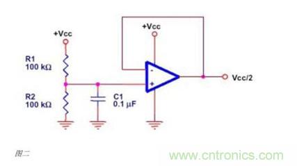 單電源工作的運放需要外部提供一個虛地,通常情況下,這個電壓是VCC/2,圖二的電路可以用來產生VCC/2的電壓,但是他會降低係統的低頻特性。