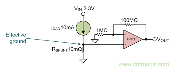 電源電壓為3.3V。在正確操作的情況下,係統得出最大電流值為10mA;你不想要有效接地,使負載高於100µV。你首先要明白一點,分流電阻的壓降(由於電流)必須小於或等於100µV。