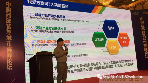 為服務西部產業創新,中電網絡技術/我愛方案網攜手四川本地技術服務商與中國電子信息博覽會來到成都,我愛方案網的CEO劉傑博士在2018中國智慧城市高峰論壇做大會報告,圍繞“AI支撐智慧城市和IoT技術方案發展”做了主題講演,分別介紹了AI發展路徑;通過大數據分析AI應用市場需求市場;解讀了AI處理器推動邊緣計算;列舉了大量AI物聯網方案開發案例,引起論壇參會人員的深度思考。