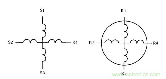 如上圖1所示,S1-S3作為勵磁繞組,S2-S4作為定子交軸繞組,兩者空間互相垂直且匝數、型式完全相同。R1-R3和R2-R4分別為轉子上的正弦輸出繞組和餘弦輸出繞組,它們的結構也完全相同。