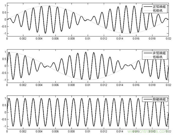 正弦繞組和餘弦繞組輸出為調幅波,其包絡線分別為正弦波和餘弦波,包絡線的頻率為50Hz,對應轉子的轉速,正弦繞組和餘弦繞組的幅值的比值的反正切就是轉子的轉角。