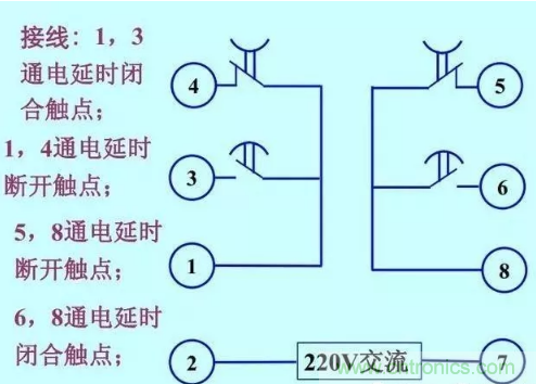 6-8腳為通電延時斷開觸點,接通電源,給了信號之後線圈得電,等到設置時間到達以後,觸點斷開;