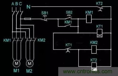 各個引腳的含義我們已經搞清楚了,下麵就可以根據控製原因進行接線,我們以下圖為例,在電路中加入KT通電延時時間繼電器,當按下啟動按鈕SB2線圈KT1、KM1得電交流接觸器KM1吸合,電動機M1轉動,延時閉合開關KT1到達時間吸合,KM2、KT2得電,交流接觸器KM2得電吸合,電動機M2轉動,延時斷開開關KT2在到達時間以後斷開,整個控製回路斷開,所有電機停止轉動;