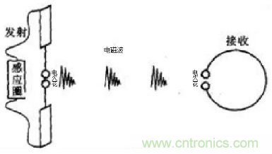 赫茲把這個接收器放在了離電磁波生成器10米遠的地方,如果真有電磁波的話,導線接收之後將會產生電流,並在這兩個小銅球之間也產生電火花。