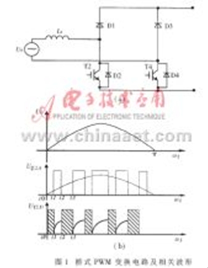 圖1(a)所示為工作在PWM整流狀態的H型橋式PWM變換電路(此圖為正弦波正半波輸入下的等效電路,上半橋的兩隻IGBT未畫出),圖1(b)為下半橋兩隻大功率器件的驅動信號和相關的器件波形。現以正半波工作過程為例進行分析(對於三相PWM電路,在整流、逆變工作狀態或單相DC/DC工作狀態下,PWM電路的分析過程及結論基本類似)。