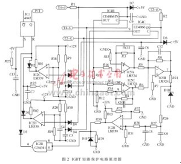 由對圖1所示電路的分析,可以得到IGBT短路保護電路的原理電路圖,如圖2所示。在圖2所示電路中, IC4及其外圍器件構成選通邏輯電路,由IC5及其外圍器件構成濾波及放大電路,IC2及其外圍器件構成門限比較電路,IC1及其外圍器件構成保持電路。正常情況下,D1、D2、D3的陰極所連接的IC2D、IC2C及CD4011的輸出均為高電平,IC1的輸出狀態不會改變。假設由於某種原因,在給T2發驅動信號的時候,H型橋式PWM變換電路的左半橋下管T2的管壓降異常升高(設電平值為“高”),即T2-d端電壓異常升高,則該高電平UT2-d通過R2加在D8的陰極;同時,發給T2的高電平驅動信號也加在二極管D5的陰極。對IC2C來說,其反相輸入端為高電平,若該電平值大於同相輸入端的門檻電平值的話,則IC2C輸出為“低”。該“低”電平通過D2加在R-S觸發器IC1的R輸入端,使其輸出端Q的輸出電平翻轉,向控製係統發出IGBT故障報警信號。如果是由於右半橋下管T4的管壓降異常升高而引起IC2D輸出為“低”,則該“低”電平通過D1加在R-S觸發器IC1的R輸入端,使其輸出端Q的輸出電平翻轉,向控製係統發出IGBT故障報警信號。由IC5A和IC5C及其外圍器件構成的濾波及放大電路將選通電路送來的描述IGBT管壓降的電壓信號進行預處理後,送給由IC5B構成的加法器進行運算處理。若加法器的輸出電平大於由R22和R32確定的門檻電平,則會使R-S觸發器IC1的R端的第三個輸入端為“低”,也向控製係統發出IGBT故障報警信號。改變由R22和R32確定的門檻電平,就可以靈活地改變這第三路報警信號所代表的物理意義,從而靈活地設計保護電路。圖2中的端子T4-d、T2-d,分別接在T4、T2的集電極上,T4-G、T2-G分別接IGBT器件T4、T2的驅動信號。在電路設計時應該特別注意的是,D8、D5、D9、D4必須采用快速恢複二極管。