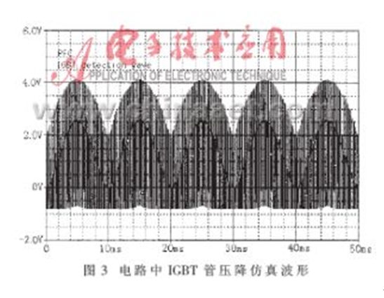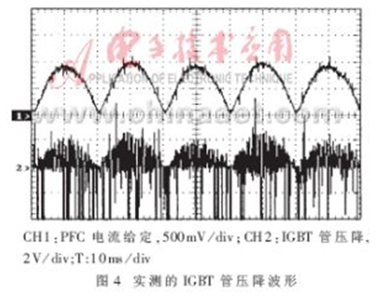 當圖1所示的PWM變換器工作在單相高頻整流模式下,應用PSPICE仿真軟件對圖2所示的電路進行仿真研究,可以得到如圖3所示的結果。圖3所示的仿真波形相當於在圖2電路中IC5B的第7腳觀察到的信號波形。仿真結果表明,檢測電路可以快速、有效地將PWM變換器的下管導通時的管壓降檢測出來。圖4所示波形是實際電路工作時檢測到的相關波形。圖中,1#通道顯示的是單相高頻整流電感電流的給定波形,2#通道顯示的是實際檢測到的圖2電路中IC5B的第7腳的工作波形。比較圖3和圖4可以得出,該檢測電路可以快速、有效地檢測出IGBT導通時的管壓降,從而對IGBT實施有效的保護。