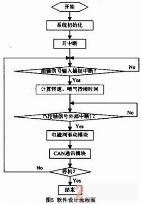 軟件設計是氣動發動機ECU開發的核心。軟件設計應遵循模塊化和標準化的原則,具有可擴展性;還hai要yao具ju有you良liang好hao的de抗kang幹gan擾rao能neng力li,可ke以yi實shi現xian自zi我wo診zhen斷duan和he保bao護hu,保bao證zheng發fa動dong機ji穩wen定ding運yun行xing。氣qi動dong發fa動dong機ji電dian控kong係xi統tong是shi對dui時shi間jian要yao求qiu很hen嚴yan格ge的de係xi統tong,它ta對dui噴pen氣qi有you很hen強qiang的de實shi時shi和he精jing確que的de要yao求qiu,主zhu要yao通tong過guo中zhong斷duan程cheng序xu的de觸chu發fa和he嵌qian套tao來lai實shi現xian。係xi統tong的de軟ruan件jian設she計ji流liu程cheng圖tu如ru圖tu5所示。控製軟件由初始化模塊、中斷模塊和主控模塊組成。初始化模塊主要完成對電控係統狀態參數的設置和配置寄存器等任務;中斷模塊執行計算轉速和判斷壓縮上止點及控製電磁閥噴氣等任務;主控模塊完成信號處理、確定噴氣定時和噴氣量以及CAN通訊等。