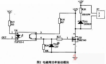 圖2所示的是電磁閥功率驅動模塊。其中,P7插座連接高速電磁閥,電磁閥線圈一端連接電源,另一端連接場效應管漏極。Q1是場效應管IRF540,起放大作用。U6是可控製的光電耦合器件TLP521-1,它廣泛應用於電路之間的信號傳輸,將ECU與負載隔離,可以增加電路的安全性,減小電路幹擾,簡化電路設計。當ECU發出驅動信號,光耦導通,穩壓二極管D10將場效應管Q1的柵極電壓穩定在12V,漏lou極ji電dian流liu增zeng大da,漏lou極ji電dian壓ya被bei拉la低di。此ci時shi,電dian磁ci閥fa線xian圈quan電dian流liu增zeng大da,線xian圈quan產chan生sheng強qiang大da的de電dian動dong勢shi,電dian磁ci閥fa被bei打da開kai。而er當dang光guang耦ou截jie止zhi時shi,電dian磁ci閥fa關guan閉bi,線xian圈quan中zhong電dian路lu變bian化hua很hen大da,會hui產chan生sheng反fan電dian動dong勢shi。R20功率電阻和D11肖特基二極管IN5819與電磁閥並聯,防止場效應管被擊穿。