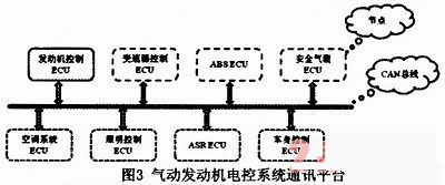 氣動發動機的控製係統是極其複雜的,不僅包括轉速、油門位置等信號的采集處理;還要對電磁閥的噴氣定時和噴氣量完成精確控製等等。另外,氣動汽車上還包括ABS、kongtiaoxitonghecheliangdengguangdengmokuai,zhexiemokuaixuyaoshishigongxiangcheliangdeshuju,yidadaozhengchedezuiyoukongzhi。chuantongdedianqikongzhishejicelveyijingbunengmanzudangjindianqikongzhiwangluodexuyao,erCAN總線的數據通訊具有突出的可靠性、實用性和靈活性等特點。氣動發動機電控係統通訊平台如圖3所示。它具有布線成本低、通訊速率高和數據傳輸精度高等優勢。