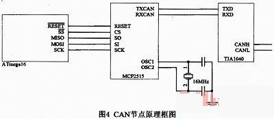 CAN節點原理框圖如圖4所示。本文采用TJA1040高速CAN總線收發器作為CAN協議控製器和物理總線之間的接口,選用Mierochip公司推出的MCP2515作為CAN總線控製器,它符合CAN2.0B技術規範並帶有符合工業標準的SPI串行接口。ATmega16通過同步串行接口SPI與MCP2515之間完成高速的全雙工的同步數據傳輸,MCP2515通過CAN物理接口芯片TJA1040連接到CAN總線上,完成氣動發動機電控係統與PC機等的CAN通訊。