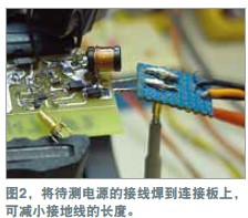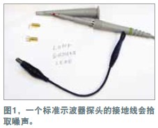 在測量電源軌的紋波時,必須盡量減小噪聲,因為紋波幅度可能很小。示波器探頭是基本的測量工具,但它們可能引入噪聲與誤差。地線(如與標準示波器探頭連接的那根線)可ke能neng增zeng加jia一yi些xie不bu會hui出chu現xian在zai示shi波bo器qi軌gui跡ji上shang的de電dian路lu噪zao聲sheng。線xian路lu環huan就jiu像xiang一yi根gen天tian線xian,會hui提ti取qu周zhou圍wei的de雜za散san磁ci場chang。環huan路lu麵mian積ji越yue大da,提ti取qu的de噪zao聲sheng就jiu越yue多duo。為wei證zheng明ming這zhe個ge理li論lun,可ke將jiang示shi波bo器qi地di線xian連lian接jie到dao探tan頭tou尖jian端duan,然ran後hou到dao處chu移yi動dong。示shi波bo器qi會hui隨sui著zhe地di線xian的de移yi動dong而er顯xian示shi出chu噪zao聲sheng的de增zeng減jian。用yong一yi個ge示shi波bo器qi探tan頭tou及ji其qi地di線xian和he插cha座zuo可ke以yi做zuo一yi個ge簡jian單dan的de連lian接jie板ban(圖1)。