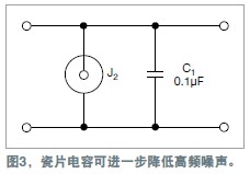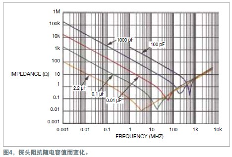 電容應采用多層堆疊式的瓷片電容,因為它能更好地去耦高頻噪聲。電解電容、紙電容以及塑料薄膜電容都有兩片金屬箔。金屬箔由一片電介質分隔開,這三部分構成一個卷狀物。這種結構有自身的電感;因此,當頻率高於數兆赫茲時,它更類似於一隻電感,而不是電容。圖4顯示了各種堆疊式瓷片電容值對電源的阻抗。
