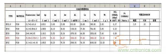 表二EF25磁芯參數