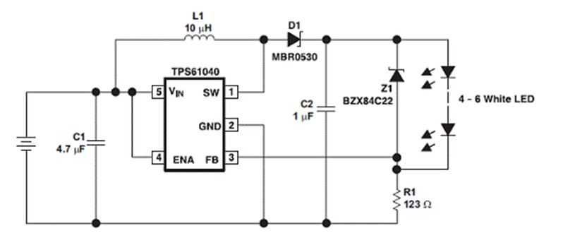 以下電路可生成 101mA 的恒定電流,能為 PDA 和數碼相機等便攜式應用驅動高達 6 個白色 LED">LED。其輸入電壓工作範圍為 1.8 V 至 6 V,可以采用兩節堿性電池或鎳氫電池輸入(1.8 V 到 ~3 V)、三節堿性電池或鎳氫電池輸入(2.7 V 到 ~4.8 V)以及單體鋰離子電池輸入(3 V~4.2 V)。這種升壓轉換器采用 R1 來設置流過 LED">LED 的恒定電流。TPS61040 產品說明書 (SLVS413) 給出了本電路的詳細描述。