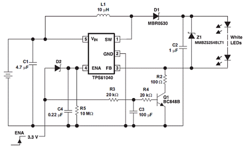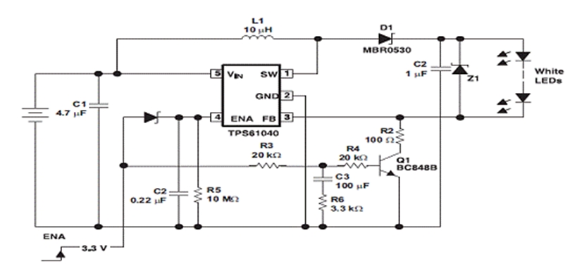 許多采用白光 LED">LED 照明和背光的消費類產品都支持開關時的漸進性 LED">LED 發光變化。這種漸進性的發光變化通常要借助可提供 PWM 發光變化控製功能的微處理器來完成。在此,我們將介紹一款采用德州儀器 (TI) TPS61040 白光 LED">LED 驅動器的電路,其在不使用微處理器的情況下同樣也可以實現開關時的漸進性發光變化。