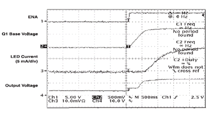 應用使能信號 (enable signal) 時,R3 將慢慢給 C3 充電,此舉會慢慢開啟 Q1。TPS61040 會通過 D2 被立即啟用。在電路閉合時,FB 到接地的初始電阻極高,從而將 LED">LED 電流限製為 0 mA。隨著 Q1 慢慢開啟,有效電阻逐漸下降,電阻的下降與 LED">LED 電流的升高有直接的關係。LED">LED 從亮度為 0% 變為 100% 的亮度,需時 1 到 2 秒鍾,具體的時間長短取決於選定的時間常數。圖 3 顯示了電路閉合時的相關波形。