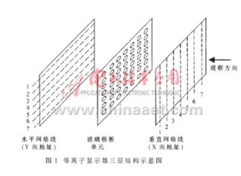 等離子顯示器是一種利用氣體放電的顯示裝置,這zhe種zhong屏ping幕mu采cai用yong了le等deng離li子zi管guan作zuo為wei發fa光guang元yuan件jian。大da量liang的de等deng離li子zi管guan排pai列lie在zai一yi起qi構gou成cheng屏ping幕mu。每mei個ge等deng離li子zi對dui應ying的de每mei個ge小xiao室shi內nei都dou充chong有you氖nai氙xian氣qi體ti。在zai等deng離li子zi管guan電dian極ji間jian加jia上shang高gao壓ya後hou,封在兩層玻璃之間的等離子管小室中的氣體會產生紫外光,從而激勵平板顯示器上的紅綠藍三基色熒光粉發出可見光。每個離子管作為一個像素,由這些像素的明暗和顏色變化組合,產生各種灰度和色彩的圖像,與顯像管發光相似。等離子體技術同其它顯示方式相比存在明顯的差別,在結構和組成方麵領先一步。其工作機理類似普通日光燈,等離子顯示器的三層結構如圖1所示。一般由三層玻璃板組成。在第一層的裏麵塗有導電材料的垂直條,中間層是燈泡陣列,第三層表麵塗有導電材料的水平條。要點亮某個地址的燈泡,開始要在相應行上加較高的電壓,等該燈泡點亮後,可用低電壓維持氖氣燈泡的亮度。關掉某個燈泡,隻要將相應的電壓降低。燈泡開關的周期時間是15ms,通過改變控製電壓,可以使等離子板顯示不同灰度的圖形。彩色等離子板目前還處於快速發展階段。