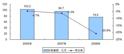 圖1 2006-2008年中國DVD播放機銷售額規模與增長